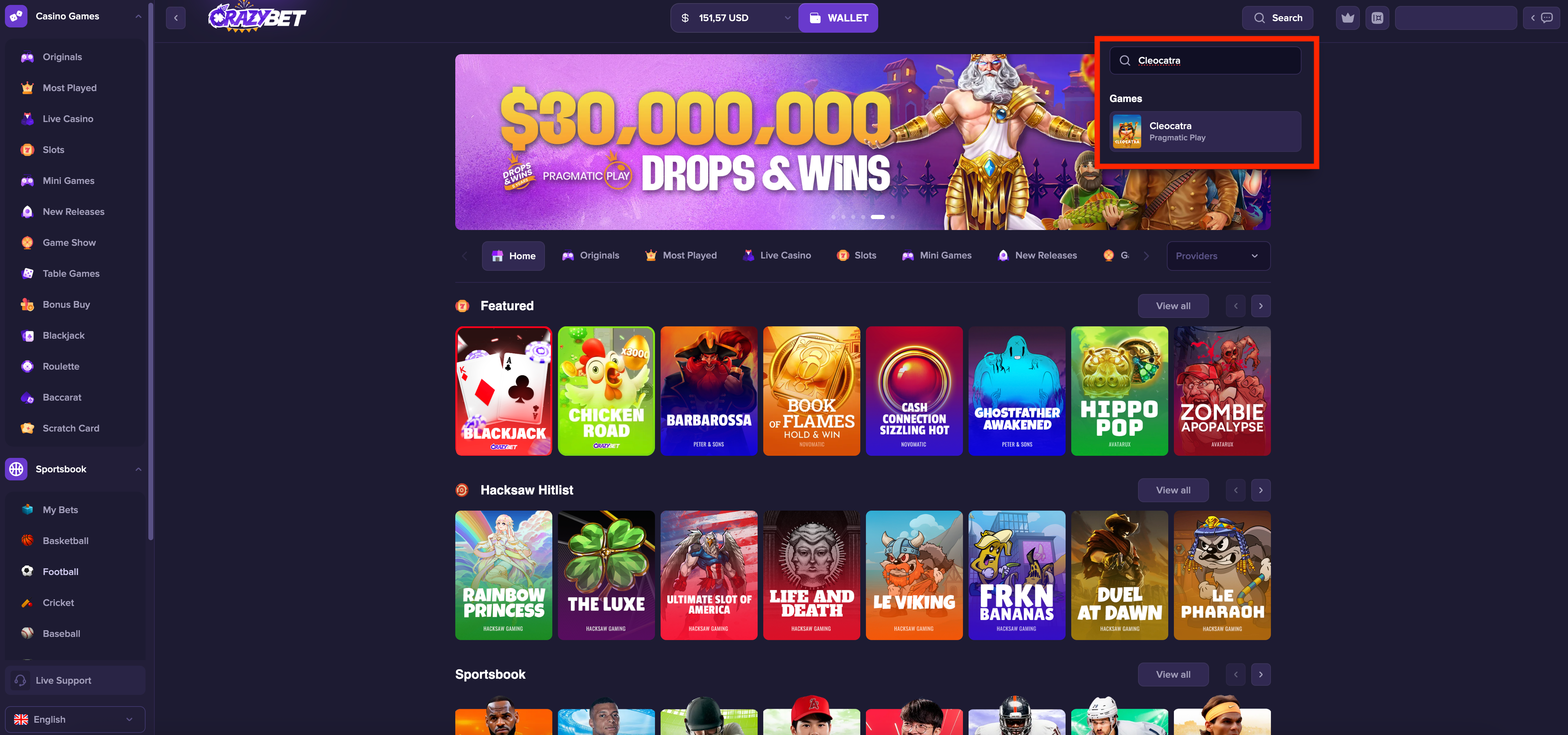 Screenshot of the CrazyBet lobby: searching for Cleocatra (Pragmatic Play) using the search bar, with the game suggestion shown, plus visible sections like Drops & Wins, Originals, Most Played, Live Casino, and Slots banners.