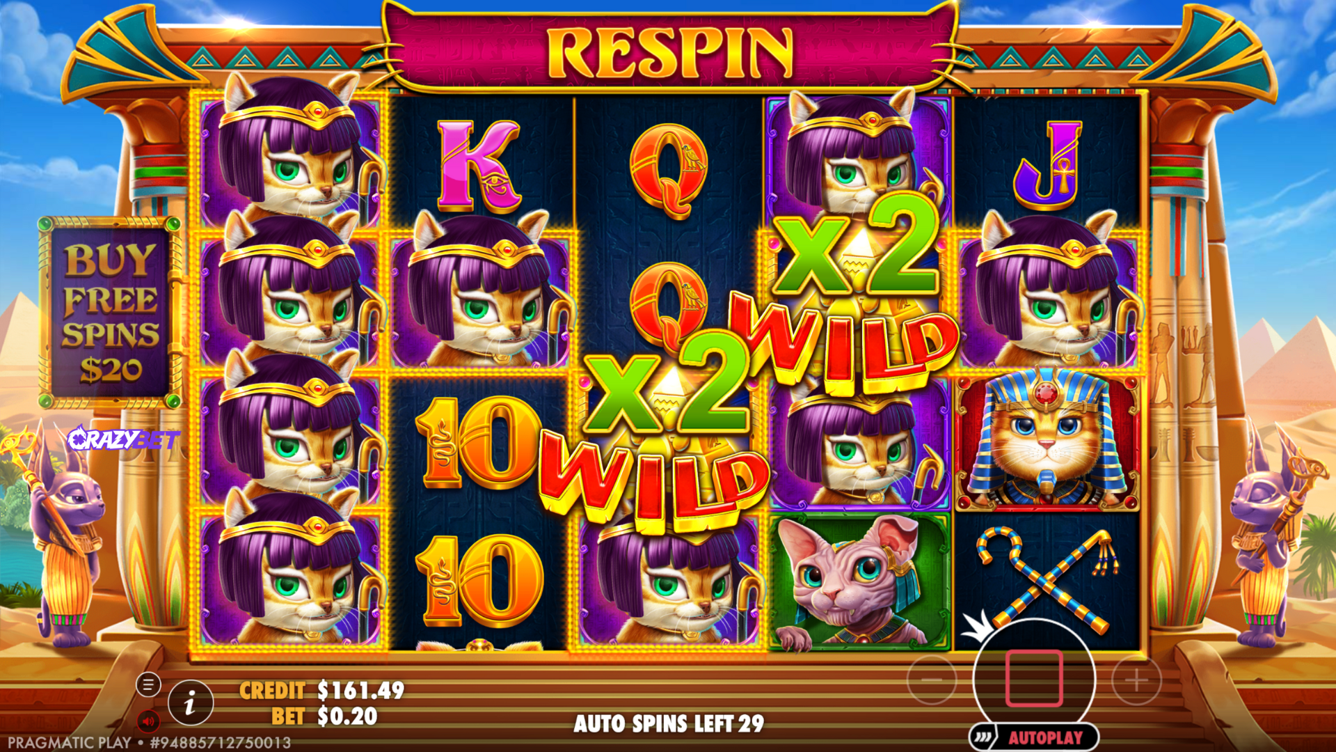 Cleocatra respin screen: x2 multiplier Wilds and stacked premium symbols (Cleocatra) covering the grid, a sequence that can lead to high payouts on CrazyBet.