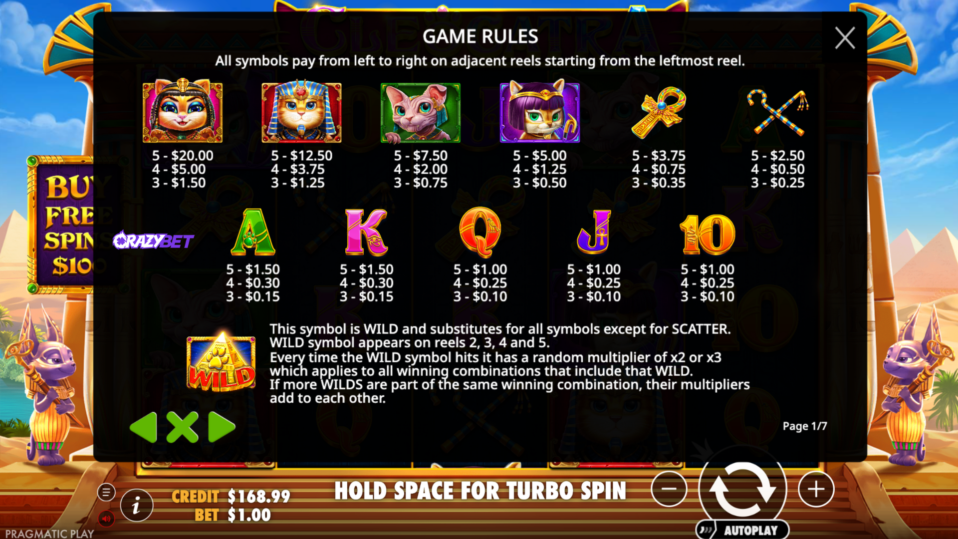 Cleocatra Payout Table (Pragmatic Play): premium symbol values and the Wild multiplier rule (x2/x3) appearing on reels 2 to 5 — CrazyBet version.